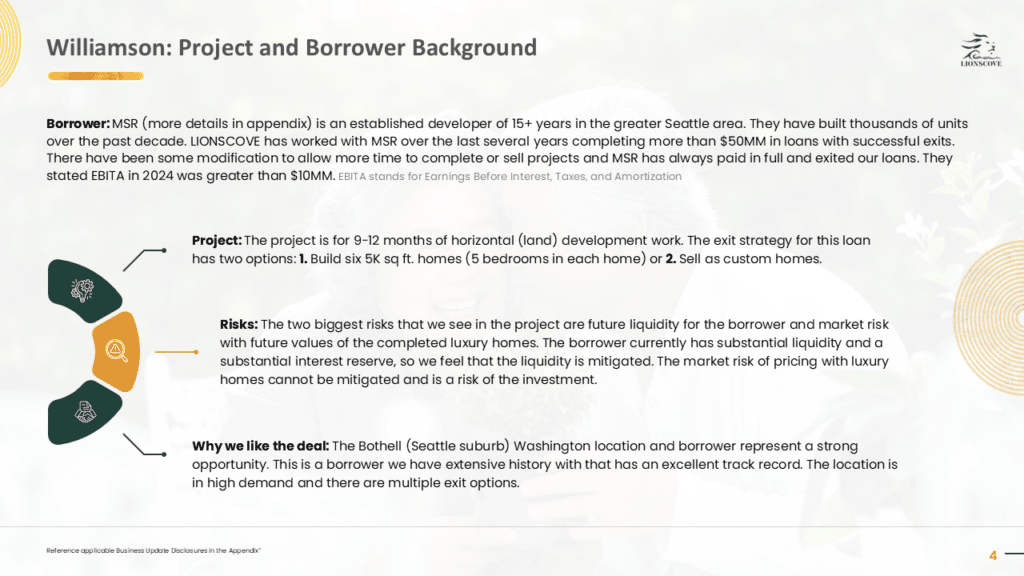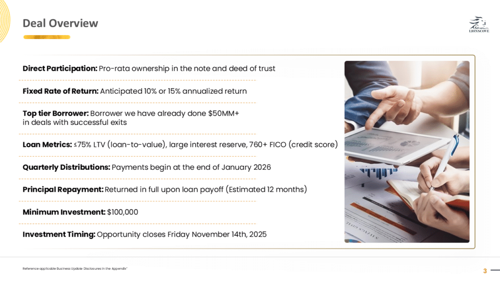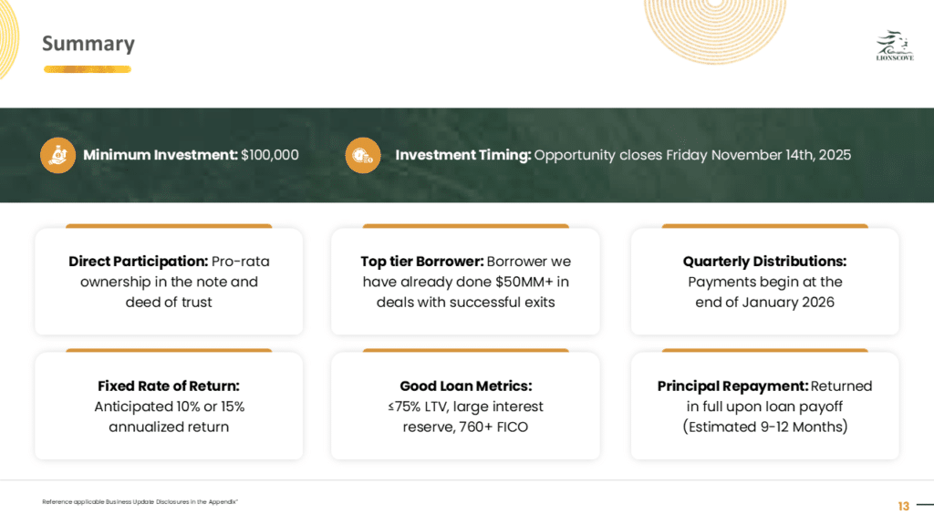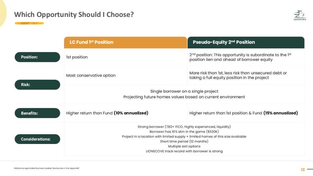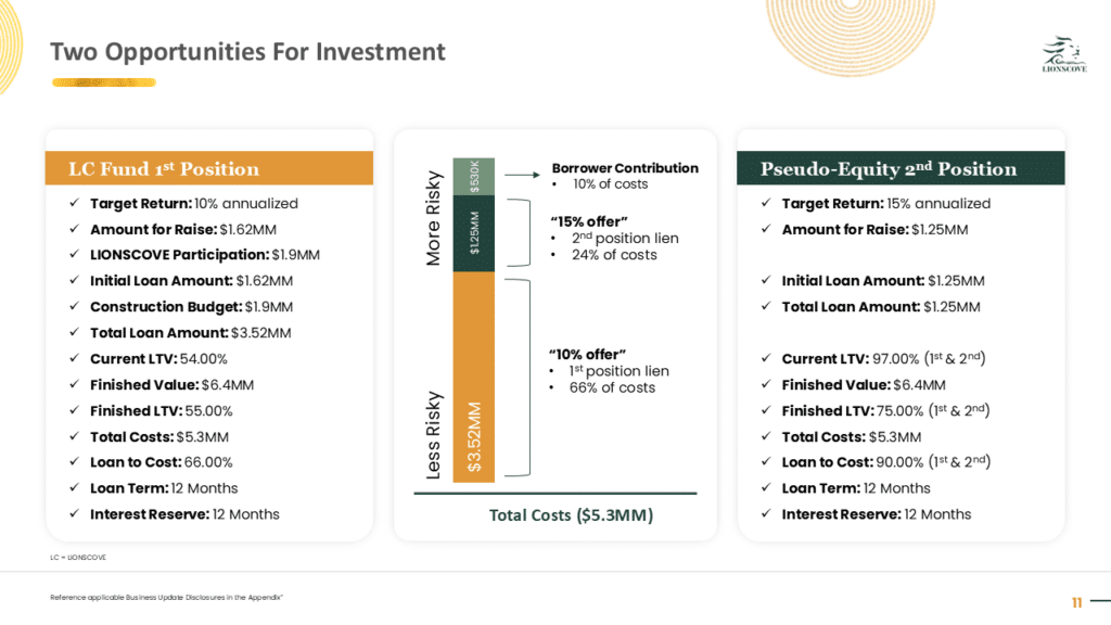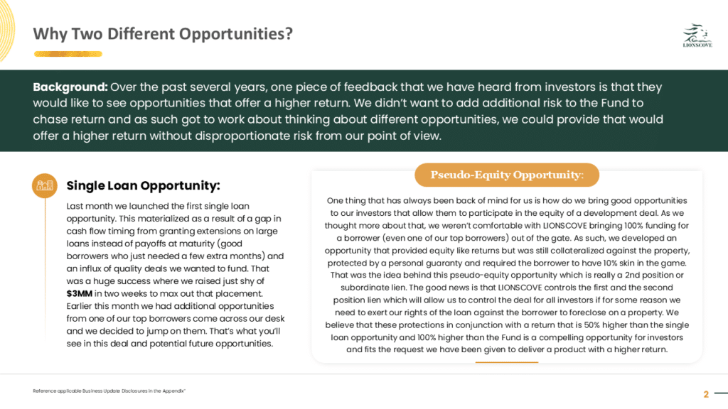 ***This material is confidential and may not be redistributed without our prior written consent. The information contained herein is for discussion purposes only with existing investors of LIONSCOVE Fund I, LLC (the “Fund”). Neither the Fund nor any officers, directors, employees or affiliates of the Fund make any representation or warranty, express or implied, as to the accuracy or completeness of the information contained herein and nothing contained herein shall be relied upon as a promise or representation whether as to the past or future performance of the Fund. No representations are made as to the accuracy of any targets, estimates, approximates or projections or that such targets, estimates, approximates or projections will be realized. Certain information contained herein constitutes forward-looking statements, which can be identified by the use of forward-looking terminology such as “may,” “will,” “should,” “expect,” “anticipate,” “target,” “project,” “estimate,” “intend,” “continue,” or “believe,” or the negatives thereof or other variations thereon or comparable terminology. Such statements are not guarantees of future performance or activities. Due to various risks and uncertainties, actual events or results or the actual performance of Fund may differ materially from those reflected or contemplated in such forward-looking statements. Forward-looking statements are based upon certain assumptions and information available on the date hereof. Actual events are difficult to predict and may be beyond the Fund’s control. The information contained herein does not purport to contain all of the information that may be required to evaluate the Fund, the Fund’s performance or the forward-looking statements contained herein. Past performance is not a guarantee or indication of future results.***